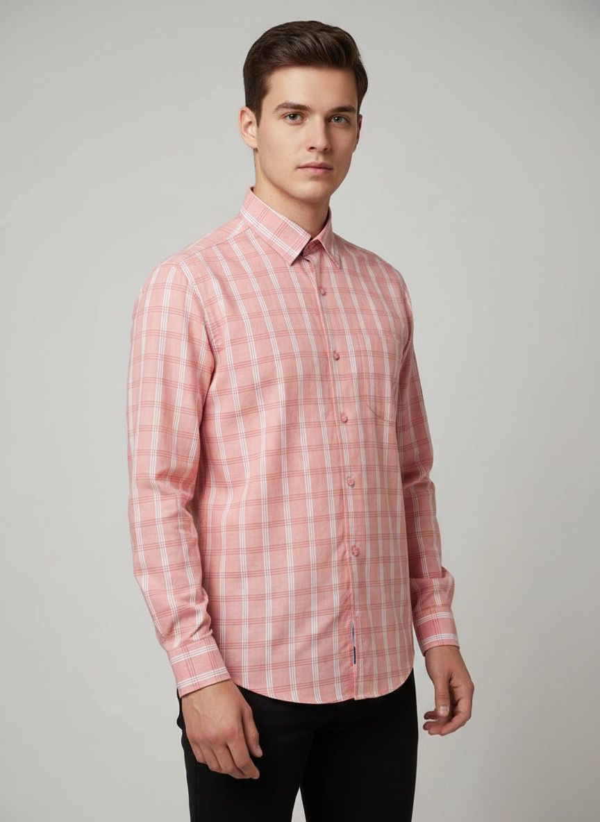 stylish pink and white checkered long-sleeve shirt, featuring a sleek collar without buttons for a modern, streamlined look.