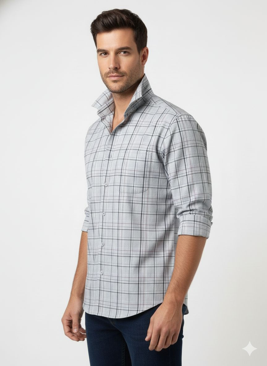 Elevate your everyday style with this modern take on a classic plaid. This grey button-down features a refined check pattern with subtle contrast lines, offering a versatile look that transitions easily from the office to a casual dinner.
