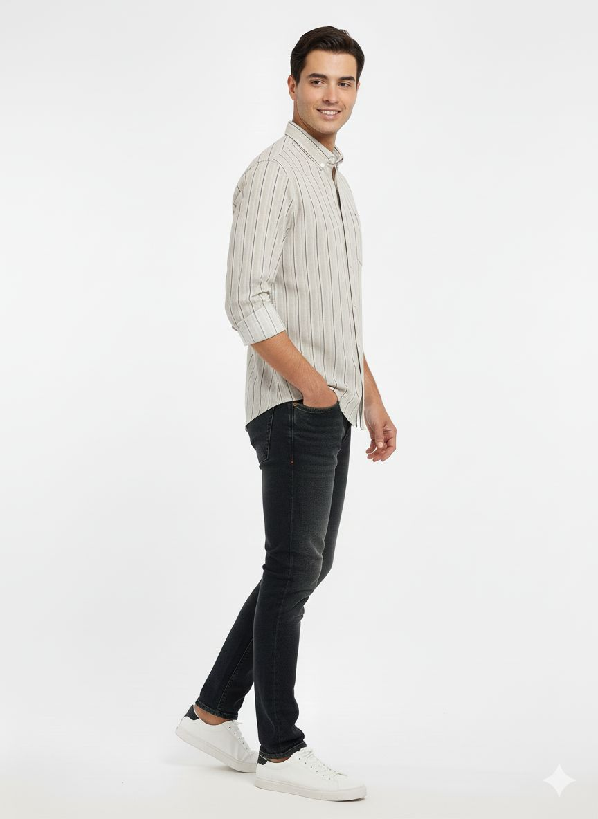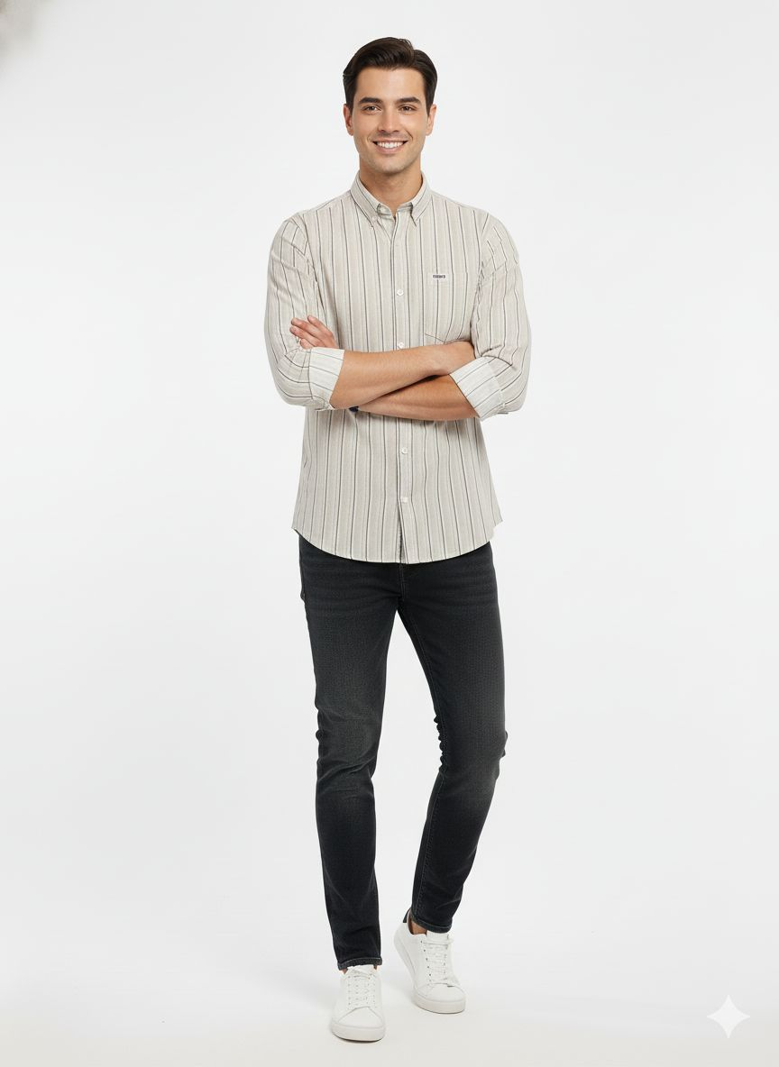 * Pattern & Color: The shirt features a refined vertical pinstripe pattern. The base color is a neutral light beige or stone, with thin, dark contrasting stripes that provide a lengthening, structured look.