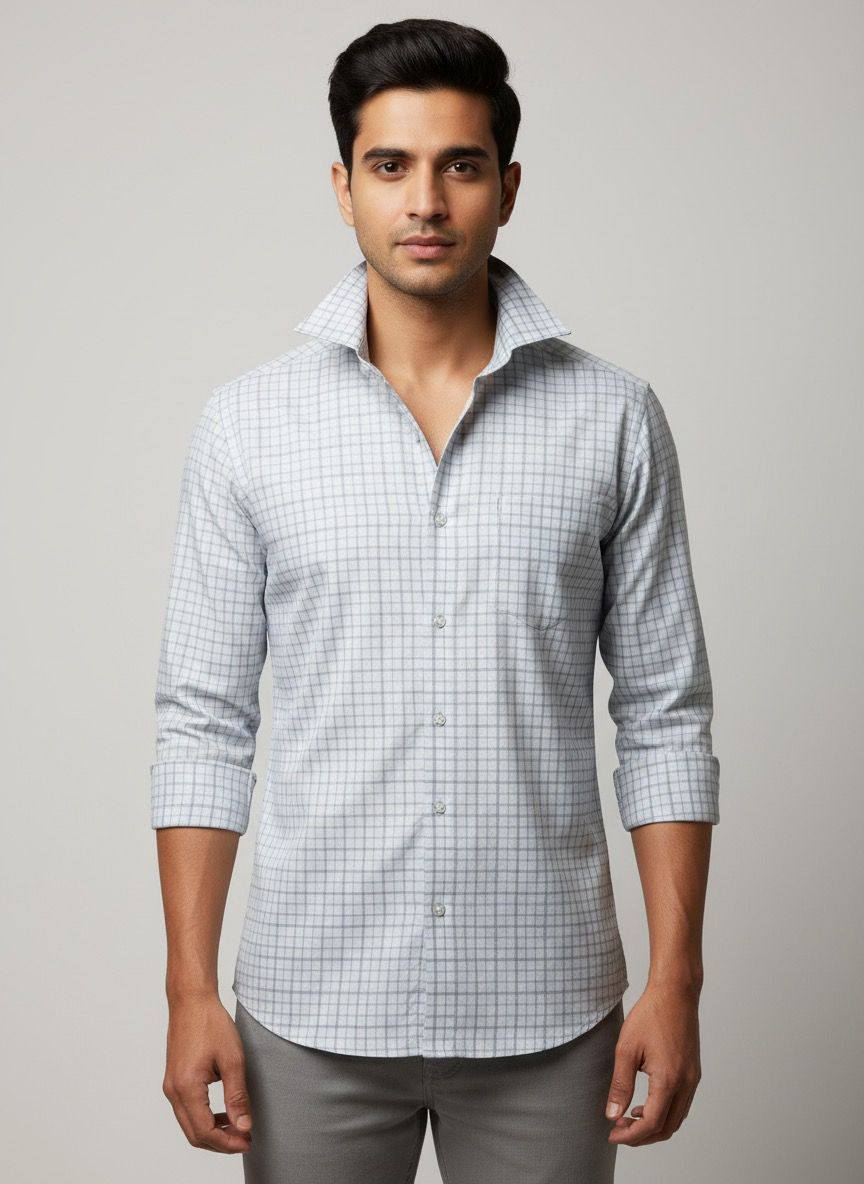 Crafted from breathable fabric with a subtle light blue and white check pattern, this shirt offers all-day comfort and versatility for office or outings.The spread collar hangs open naturally without a button, adding a relaxed yet polished vibe.