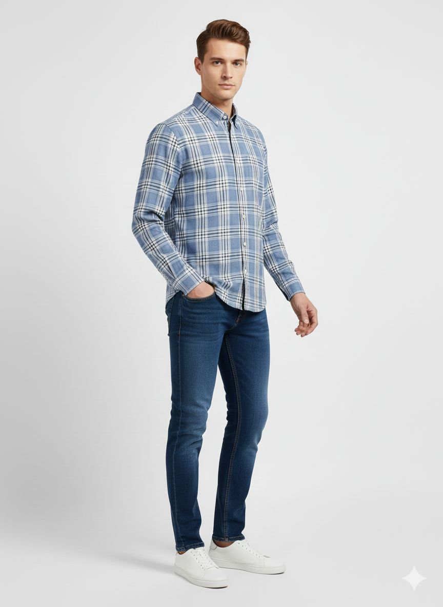 This shirt is a classic long-sleeved button-down featuring a timeless plaid (tartan) pattern. It blends a casual aesthetic with a structured, “smart-casual” design.