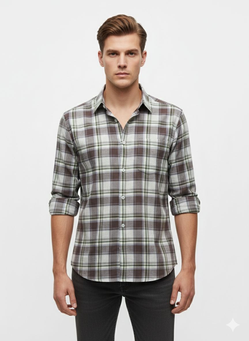 A refined checkered shirt featuring a balanced blend of grey, brown, and olive tones for a versatile, timeless look. Crafted from soft, breathable fabric, it offers all-day comfort with a clean custom-fit silhouette. The structured collar and subtle plaid pattern make it ideal for both casual and smart-casual styling. Perfect for office wear or polished everyday outfits.