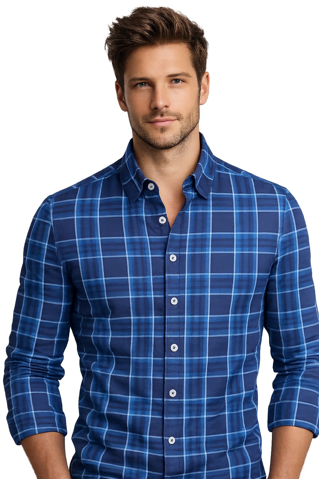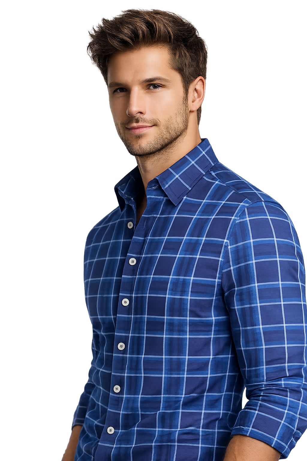 A stylish blue checkered shirt crafted from soft, breathable fabric for all-day comfort. It features a clean, button-free collar for a modern, minimal look. Perfect for both casual and smart-casual wear, offering a sharp yet relaxed fit.