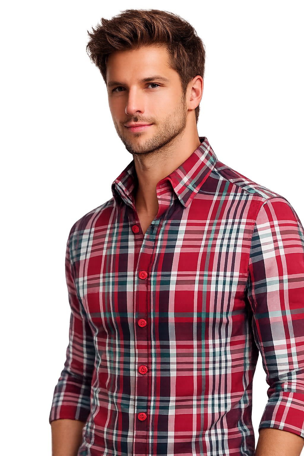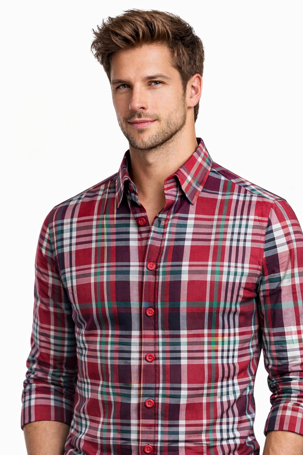 Make a bold style statement with this red multi-check shirt, crafted from soft, breathable fabric for all-day comfort. The modern custom fit offers a sharp, flattering silhouette, while the rich check pattern adds a vibrant, timeless appeal. Perfect for casual outings or smart-casual occasions, it pairs effortlessly with jeans or trousers. A versatile wardrobe essential for a confident, polished look.