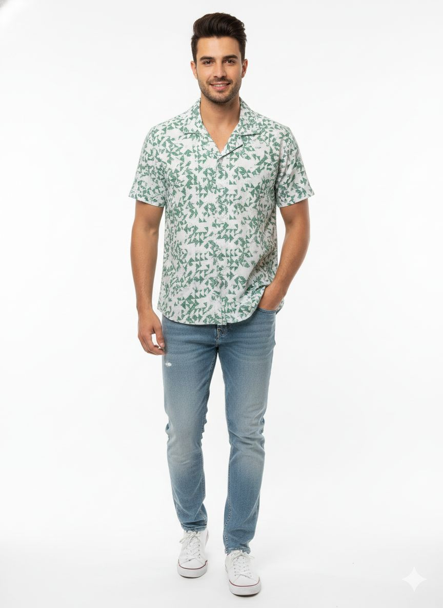 * Collar : It has a classic Cuban collar (also known as a camp collar or notched lapel), which is flat and open, perfect for warm weather or a relaxed look.