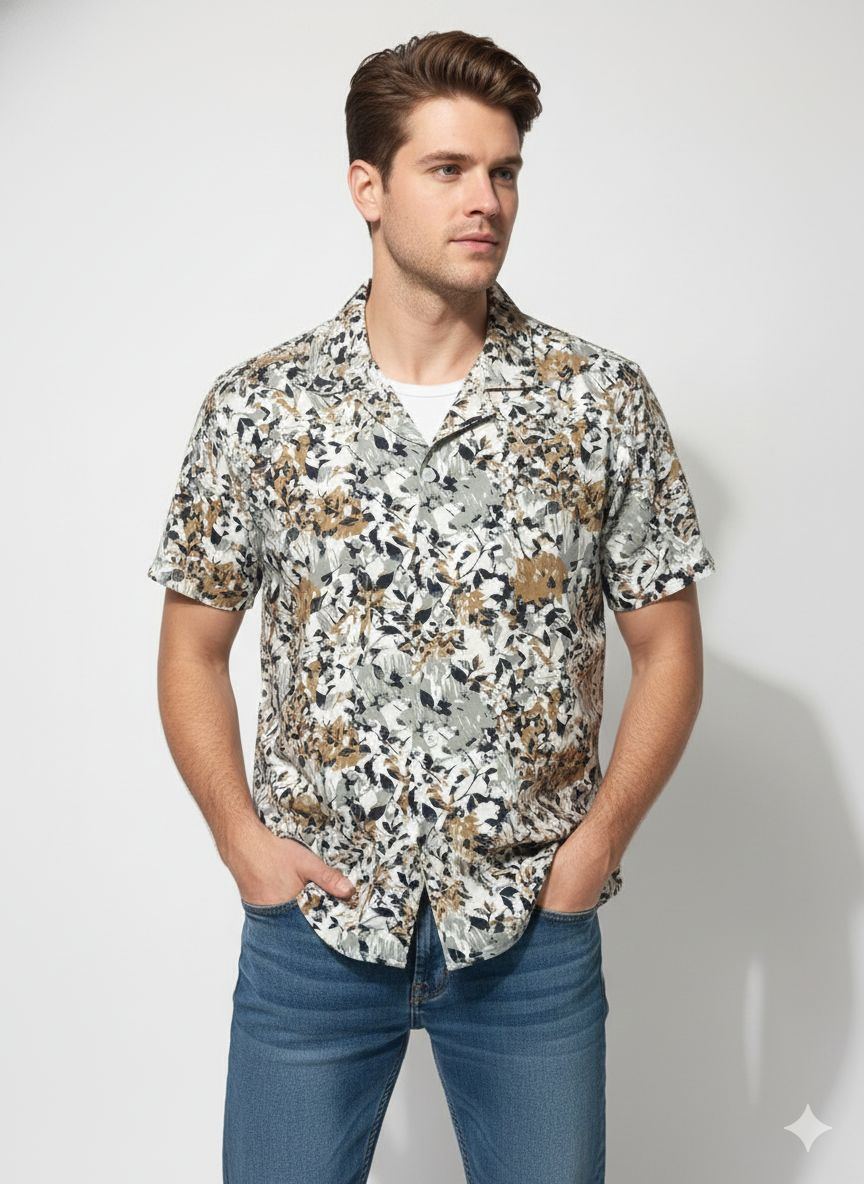 This shirt features a contemporary, artistic aesthetic with a strong focus on nature-inspired patterns. Here is a detailed breakdown of its design:
