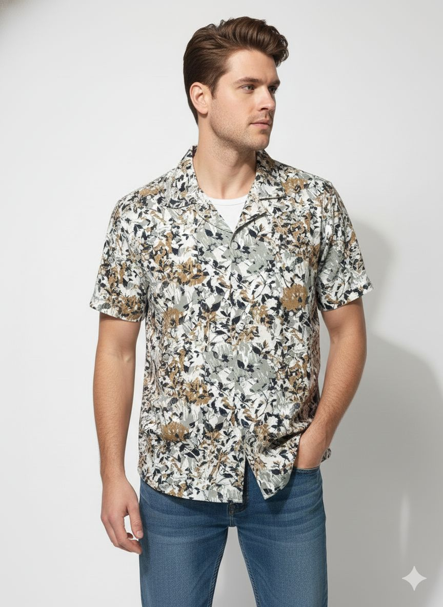 * Collar: It features a camp collar (also known as a Cuban collar), which lays flat and open, giving it a relaxed, summery feel.